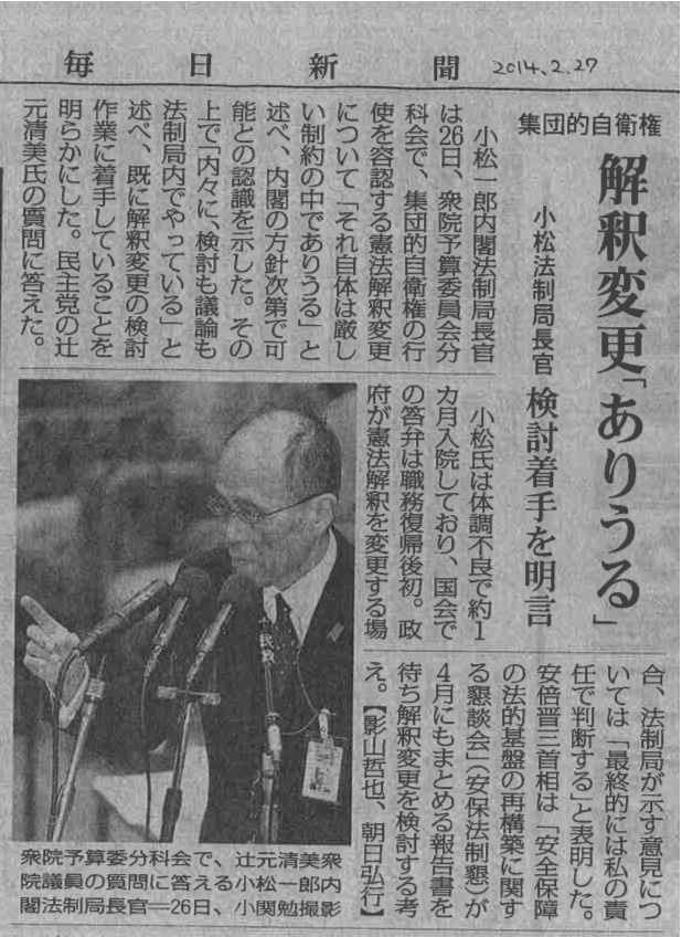 昨日の衆議院予算委員会第一分科会で私が質問した、集団自衛権の行使に関する憲法解釈の変更について、本日の新聞各紙に記事が掲載されています。