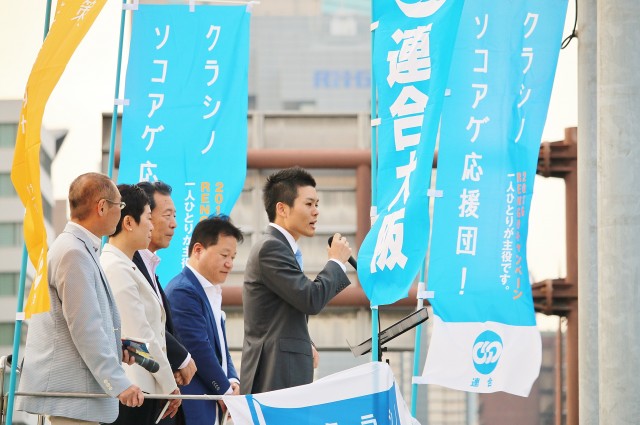 夕方18時より、淀屋橋駅前にて連合大阪主催の街頭行動「クラシノソコアゲ応援団!2016RENGOキャンペーン」に参加してきました。